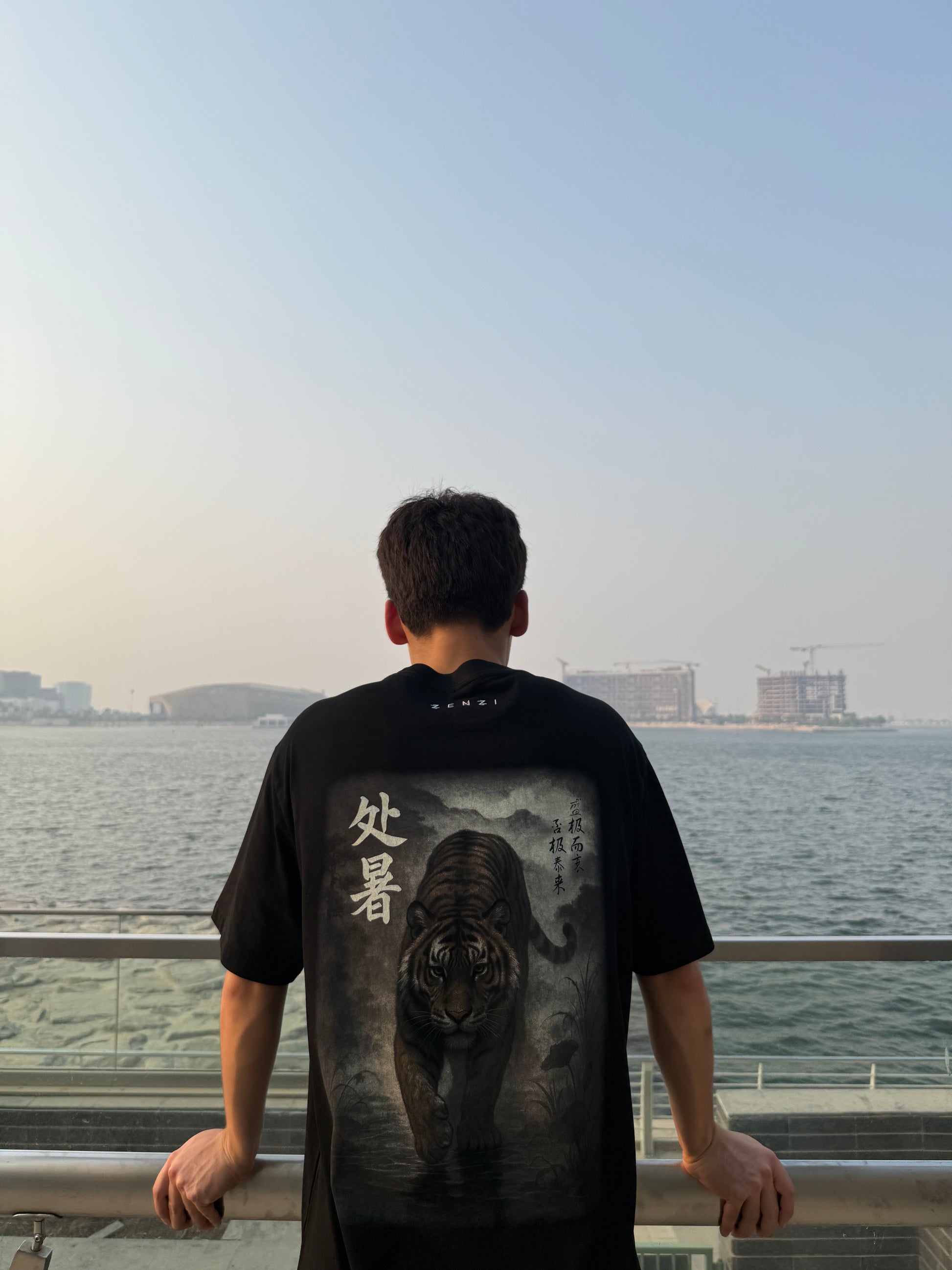 The End of Heat Summer Tee reflects this moment of transition with bold, ink-wash inspired graphics that channel the tiger — in Chinese tradition, a guardian against the evil. Earthy tones are layered with darker shades for a composed look, while bold calligraphy ties the design to its cultural roots.